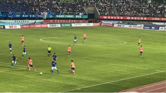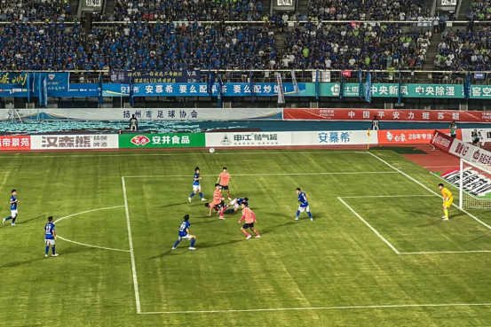 尽管比分落后,扬州队球员们却展现出顽强斗志,始终未曾放弃。他们在场上积极拼抢,进攻组织愈发流畅,状态渐入佳境。比赛进行到第 87 分钟,扬州队通过精妙配合撕开对手防线,持球球员果断起脚射门,可惜足球击中球门框弹出,错失了扳平比分的绝佳机会。在 90 多分钟的鏖战里,扬州队球员们每一次倒地后的迅速爬起,每一次抽筋后的咬牙坚持,都生动诠释着足球运动最原始的热血与拼搏精神。